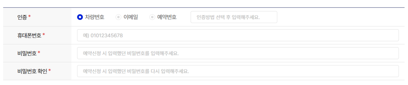 예약을 위해 차량 번호와 차량 종류를 입력해야 합니다. 일반 차량, 전기차, 소형차 등 다양한 차량 옵션이 제공되므로, 본인의 차량 종류에 맞는 옵션을 선택해야 합니다.