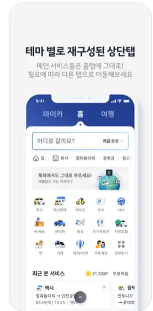 카카오 T의 혁신을 통해 모든 이동의 고민으로부터 벗어나 더 편하고, 즐겁고, 가치 있는 일상을 만들어갑니다. 테마 별로 재구성된 홈 상단탭에서 원하는 서비스를 찾아 이용해보세요. • 홈
