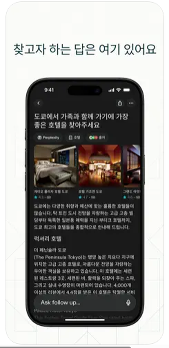 iOS 사용자도 App Store를 통해 퍼플렉시티 AI를 간편하게 이용할 수 있습니다. 애플의 UI 환경에 최적화된 디자인으로 제공되며, 질문 입력 후 AI의 응답을 빠르게 확인할 수 있습니다. 특히 Siri와의 연동이 가능하여 음성으로 질문을 던지고 결과를 받아보는 것도 가능합니다.
